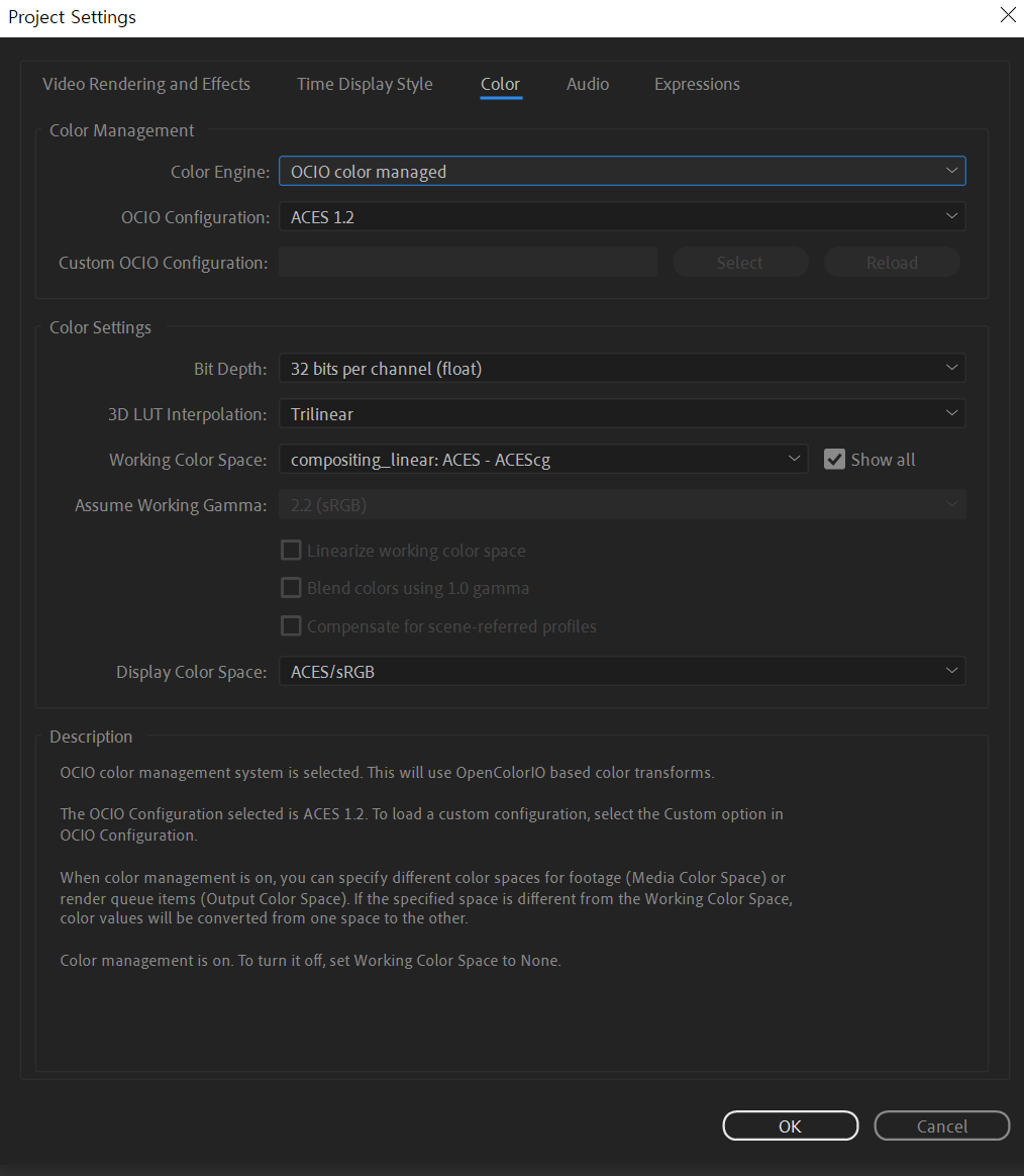 애프터이펙트에서 OCIO설정을 다시 어도비컬러로 바꾸면 오류메시지가 안뜨는데 무슨 오류인가요?