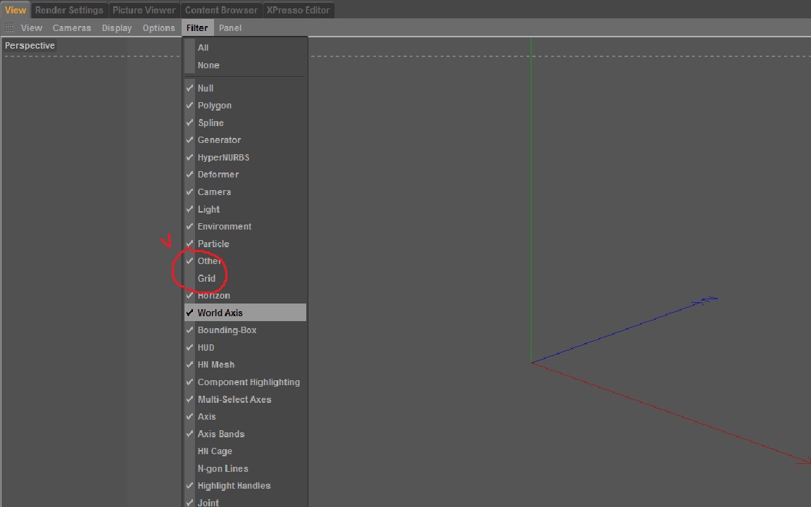 뷰포트에 다려있는 텝을 보시면 filter가 있는데 여기서 그리드 체크해제하시면 돼요