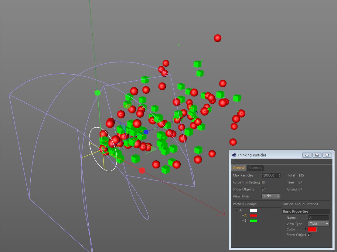 플레이하는 중간에 멈추고 파티클 지오메트리에 B그룹을 넣으니, 다음 스샷과 같이 일시적으로 일치하는 결과를 보여줍니다만.