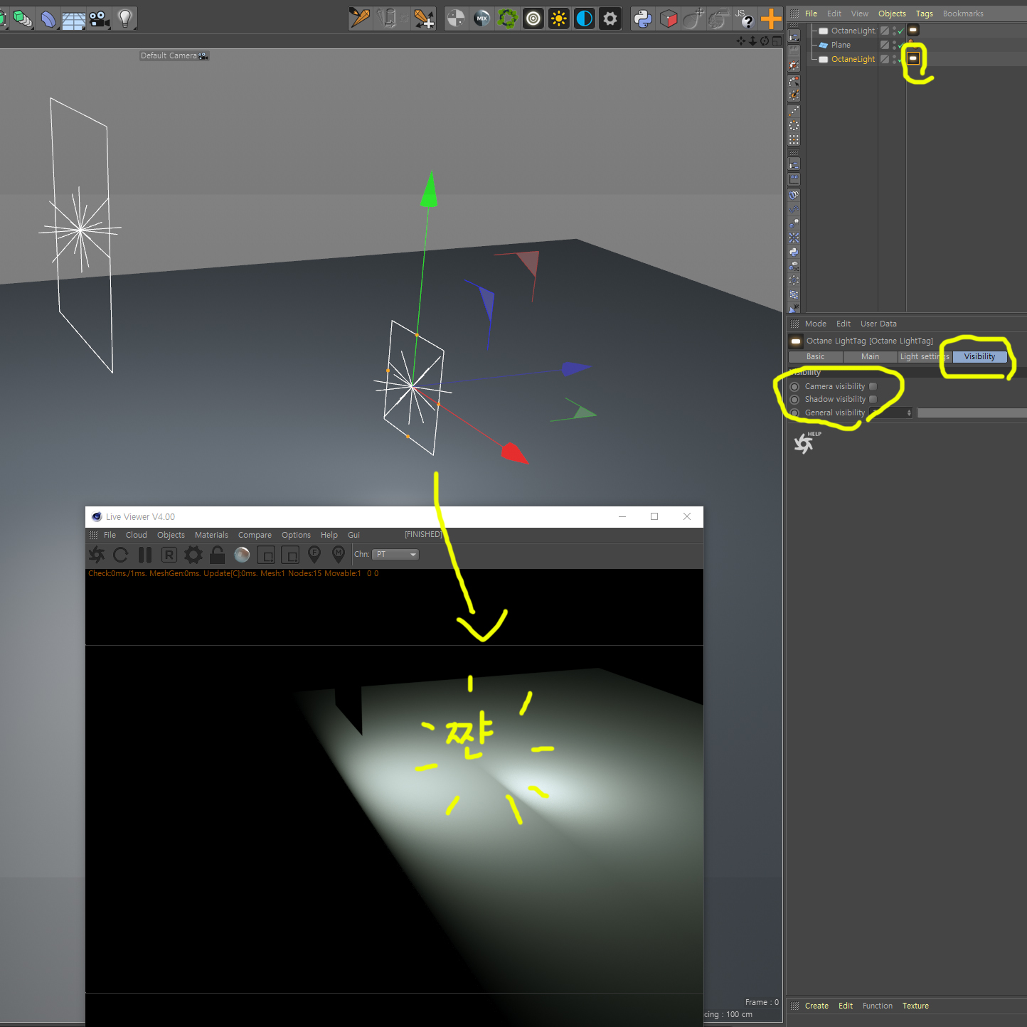 카메라 비지빌리티를 끄면 렌더창에 안보이지만 라이트판때문에 생긴 그림자는 그대로 있습니다