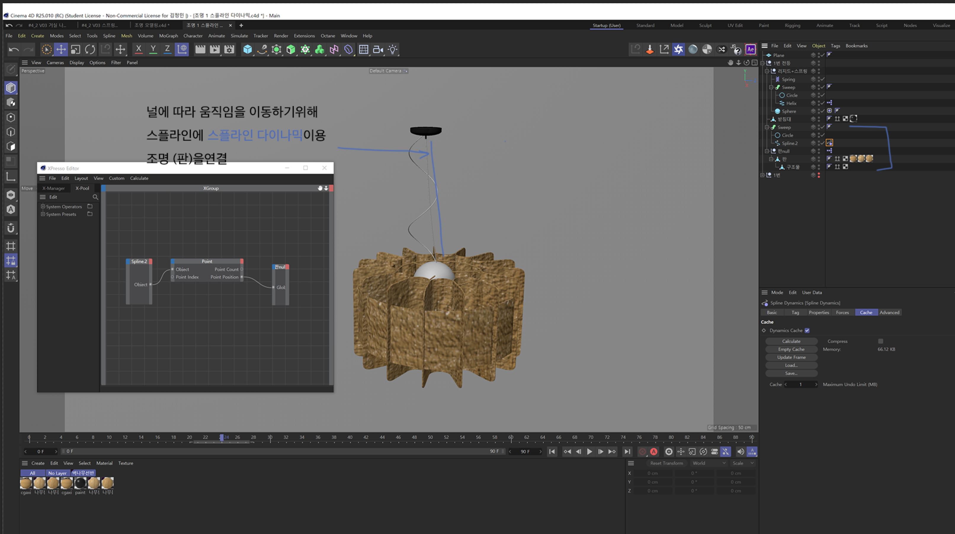 안녕하세요! c4d 스플라인 다이나믹을 이용한 벽에 붙어있는 전등 작업 학습중
