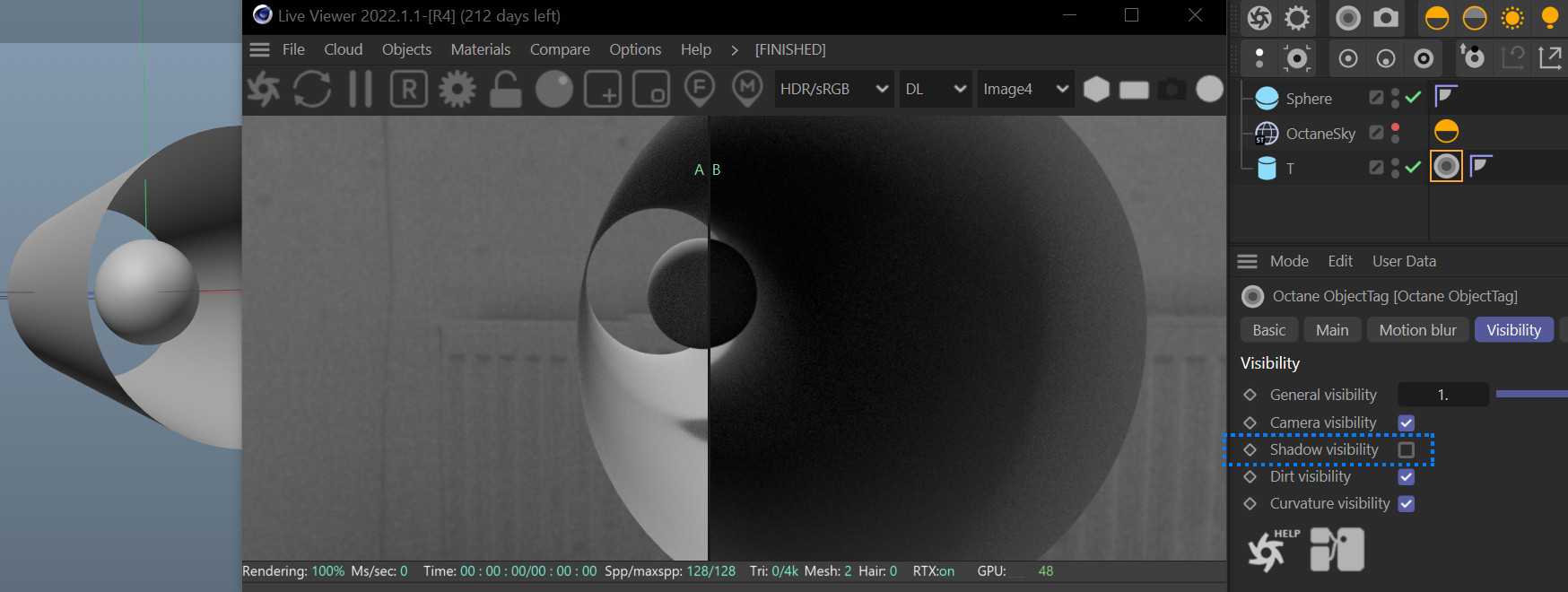 터널 오브젝트에 Octane Object Tag를 걸고 Visibility > Shadow Visibility를 Off해 보십시오.