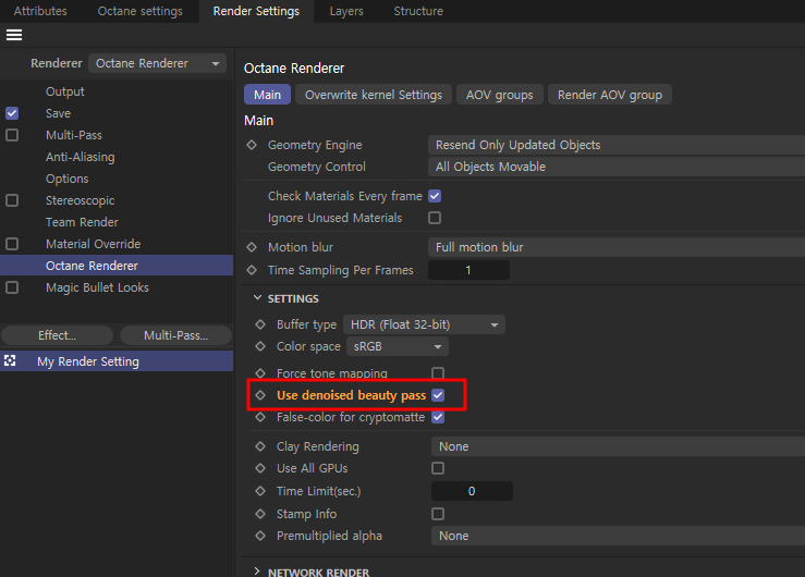 옥테인 렌더세팅에서  Main / Use denoised beauty pass 활성화 시켜주세요.