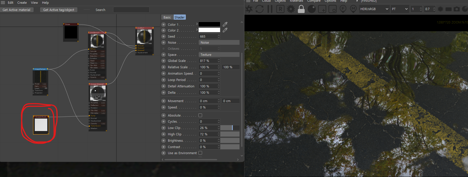 저는 우선 그냥 따라하기위해서 간소화해서 재질 만들어봤구요, 믹스로 섞기 전 상단이 아스팔트, 하단이 물웅덩이입니다. Amount는 그냥 노이즈로 줬어요