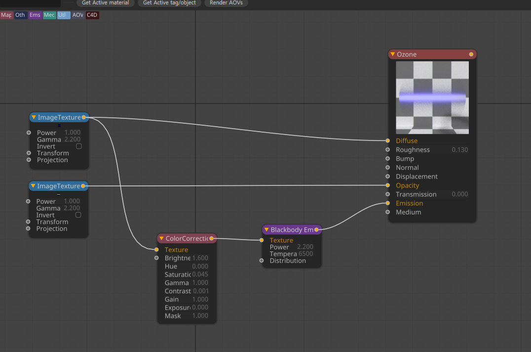 저는 행성 작업할때 오존층의 산란되는 부분이 Falloff 로는 생각보다 포스트한~느낌이 이쁘게 잘 안나오는거 같아서 행성 오브젝트 바로 뒷부분에 페이크 형태로 오존을 만들어 넣는데, After effects Saber Plugin 으로 만든 레이저(?) 형태를 Alpha 값이 있는 PNG로 뽑아 원하는 색상으로 이미션적용 및 알파값을 적용한 후에 작업중이신 행성 표면 곡률에 맞게 FFD 나 Bend Defomer 로 모양에 맞게 수정해서 넣고 나중에 AE 에서 라이트패스로 글로우를 넣어 좀더 강조하면 생각보다 자연스럽게 나와 해당 방식으로 종종 작업하고있습니다!ㅎㅎ