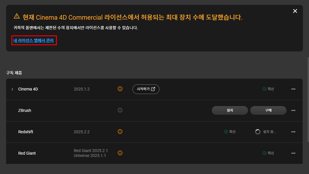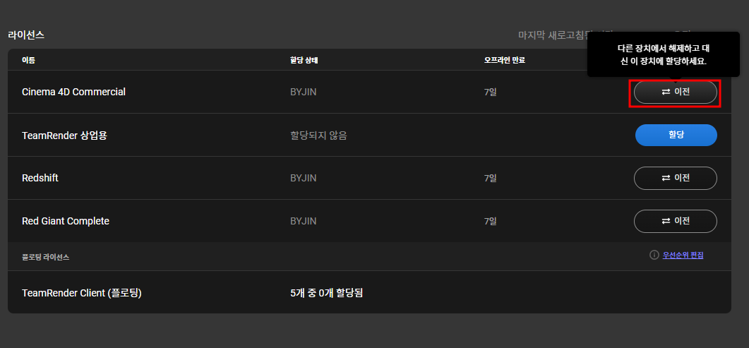 처음에 결제된 라이센스는 맥북에 설치 되어있는 프로그램에 라이센스가 만료되서 거기서 로그인 후 사용했습니다. 그 이후에 데스크탑에서 사용하기위해 해당 계정에서 맥북은 삭제하고 데스크탑으로 라이센스 사용하겠다는 걸로 선택해서 사진에 보이시는 것 같이 데스크탑으로 변경을 하였는데요. 근데 할당 된 라이센스가 일주일짜리로 되어있어서 체험판같은게 데스크탑에 깔리게 되었습니다. 분명 사용 가능한 라이센스에 사용중이라고 뜨는데(본 캡쳐는 맥북으로 하였습니다) 설마 맥북에서 시작해서 데스크탑으로 옮겨도 사용이 불가능한걸까요?? 데스크탑으로 1달 구독하는 라이센스를 사용하고싶습니다 ㅜㅜ 선배님들 도와주세요,,,,