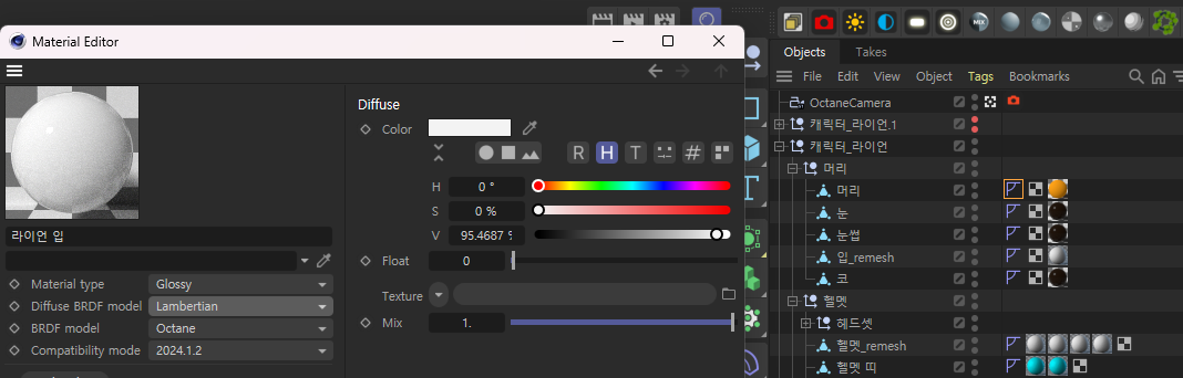 Diffuse BRDF model이 'Octane'이 아닌 'Lambertian'으로 자동 생성되더라구요. ㅠㅠ