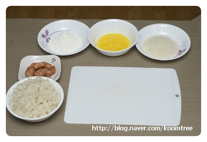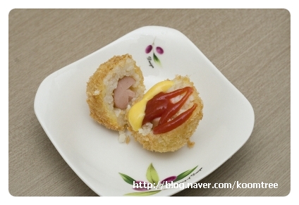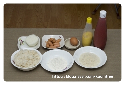 재료 :  비엔나 소세지, 밥, 양파(당근, 피망), 계란, 튀김가루, 빵가루, 케찹, 머스터드, 소금, 식용류