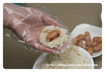 볶아진 밥을 적당히 쥐고 구어놓은 소세지를 올려 모양을 만들어 줍니다.