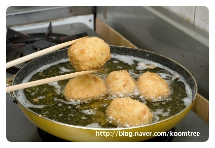 튀김반죽을 넣어서 온도를 볼때는 튀김 반죽이 바닥에 가라앉았다가 1~2초 뒤에 떠오르면 적당한 온도입니다.